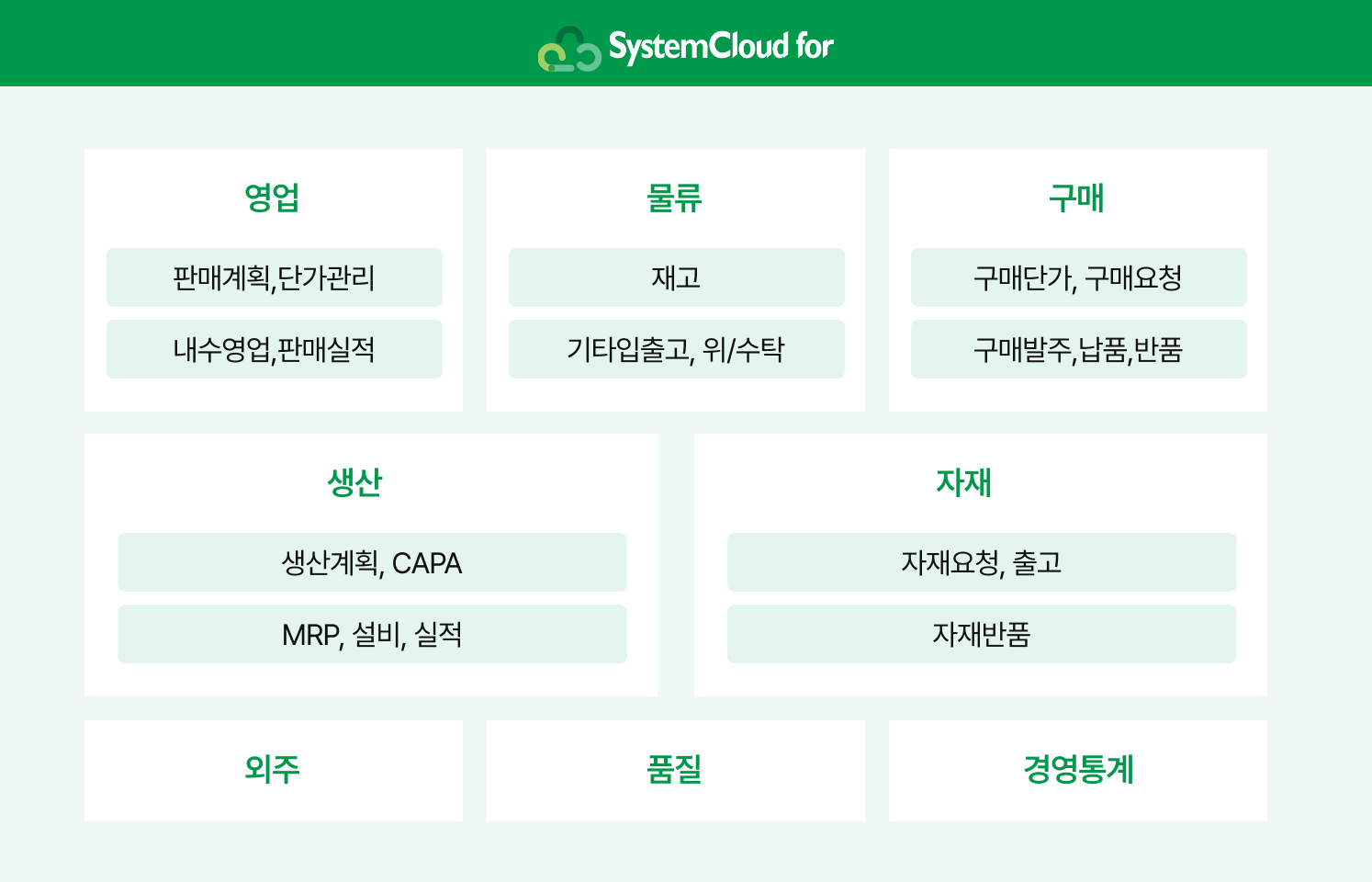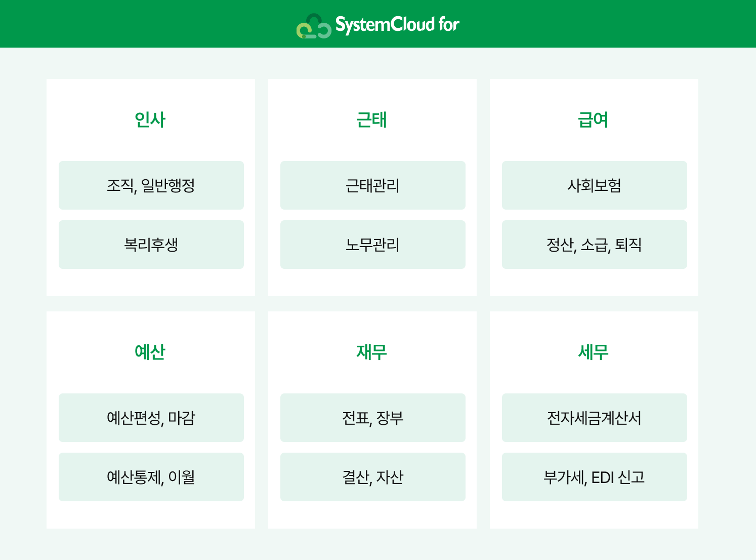 - SystemCloud for 제공범위: 인사, 급여, 회계, 예산, 세무, 물류, 제조