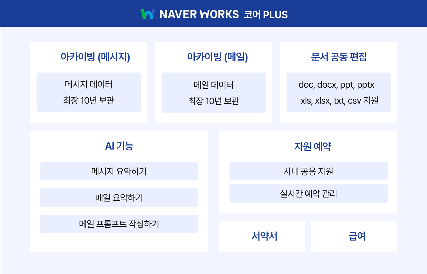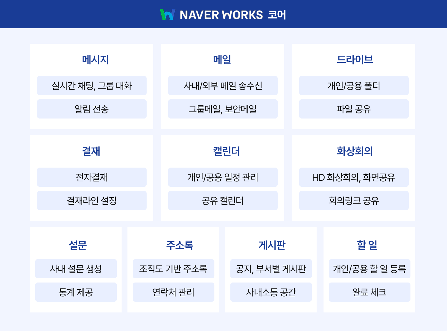 - 네이버웍스 제공범위: 메일, 메신저, 전자결재, 드라이브, 캘린더, 화상회의, 설문, 주소록, 게시판, 할 일